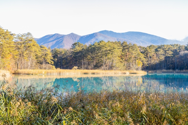 観音沼森林公園は福島県南会津郡下郷町にある自然公園で、標高約900mの高地にあるため気温が早く冷え込みます。例年10月中旬から11月上旬にかけて木々が赤や黄色に染まり、湖面に映る鮮やかな紅葉風景が楽しめます。周囲の山々も彩られ、広大な自然が秋色に包まれる光景は見る者を魅了します。